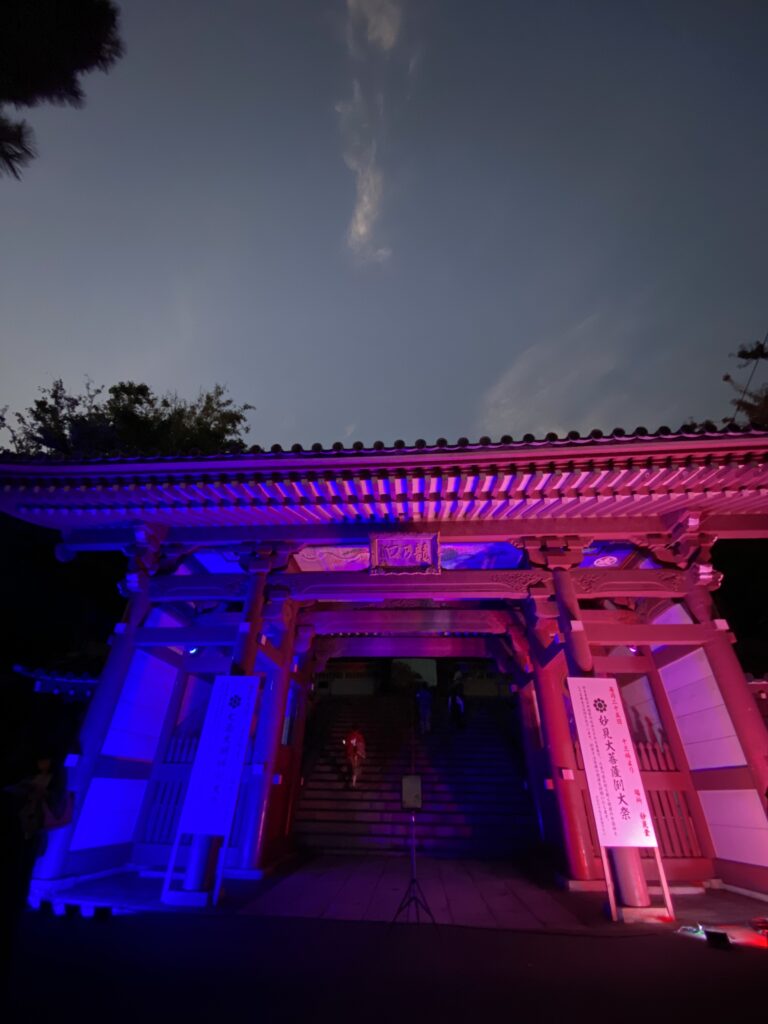 17時から、龍口寺の門がピンクと青にライトアップされ、今年も多くの方が祈りに来られました。