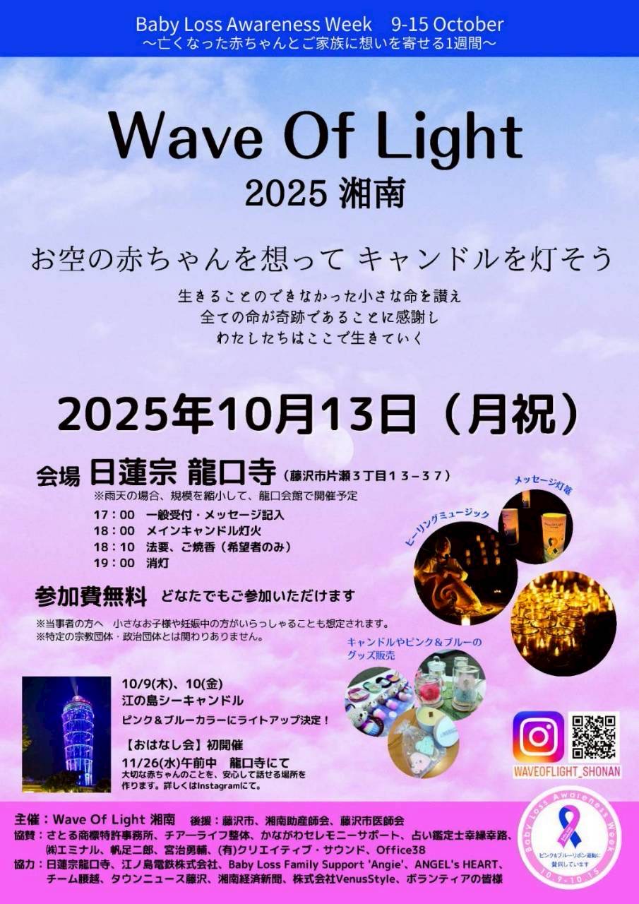 Baby Loss Awareness Week(ベビー・ロス・アウェアネス・ウィーク)は、赤ちゃんの死や流産、死産、早期乳児死亡などを経験した親や家族への理解と支援を広めるための国際的な啓発週間で、Wave of Light(ウェーブ・オブ・ライト)は、Baby Loss Awareness Weekに合わせて、世界中で一斉にキャンドルを灯すイベントです。