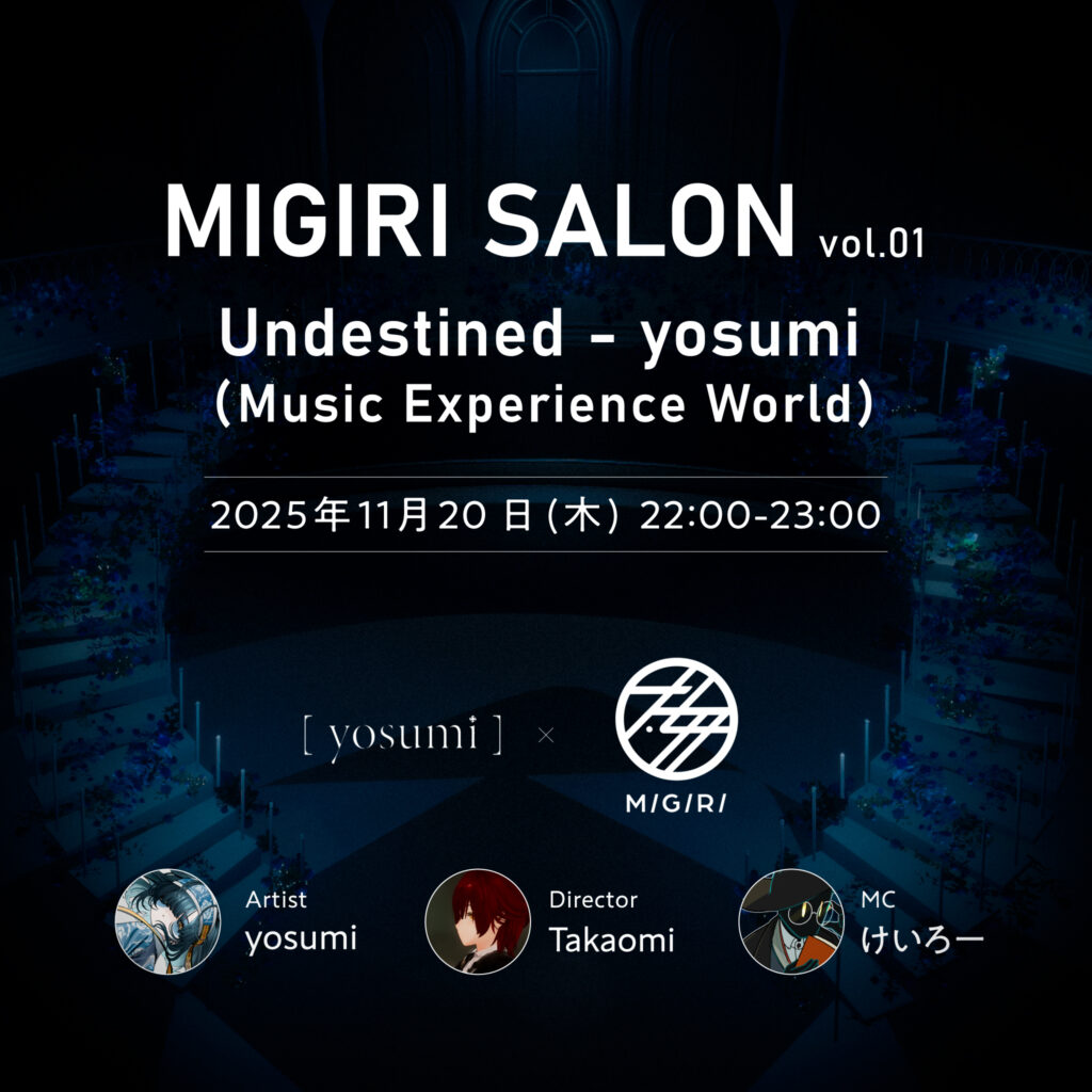 また、11月20日(木)の22:00よりyosumiとTakaomi(MIGIRI Inc.)による制作裏話トークイベント「MIGIRI SALON vol.01 “Undestined – yosumi (Music Experience World) “」を実施いたします。MIGIRIのVRChatグループのグループインスタンスで開催します。参加を希望される方はグループに参加をお願いします。なお、インスタンスはひとつで行うため参加上限人数がございます。
