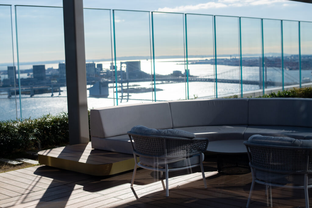 ラウンジのデザインは、「開放感」「多様性」「創造性」をテーマに、海風が届く芝浦エリアらしい抜け感と、オフィスワーカーの集中と休息を両立できる静けさを両立。高層階ならではの眺望を活かした窓際席のほか、チームで使えるソファエリアや、個人がゆっくり過ごせるカウンター席も備えています。コクヨが設計した家具や照明が、利用シーンに応じた自然な切り替えをサポートし、まさに働く人のウェルビーイングを支える空間となっています。