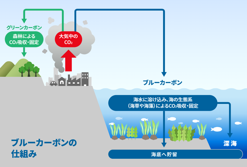 海洋生物によって吸収・貯留された炭素のことを「ブルーカーボン」と呼びます。