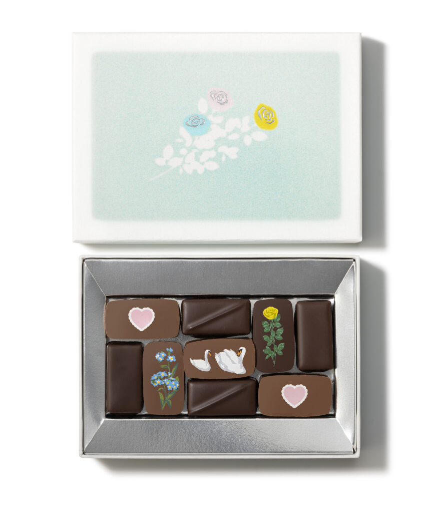 白鳥やお花をプリントした華やかなローズの香りや、ナッツの味わいのチョコレート。ナッツやベリー、レモンをトッピングした、彩り豊かなマンディアン。2種類のチョコレートを詰め合わせました。