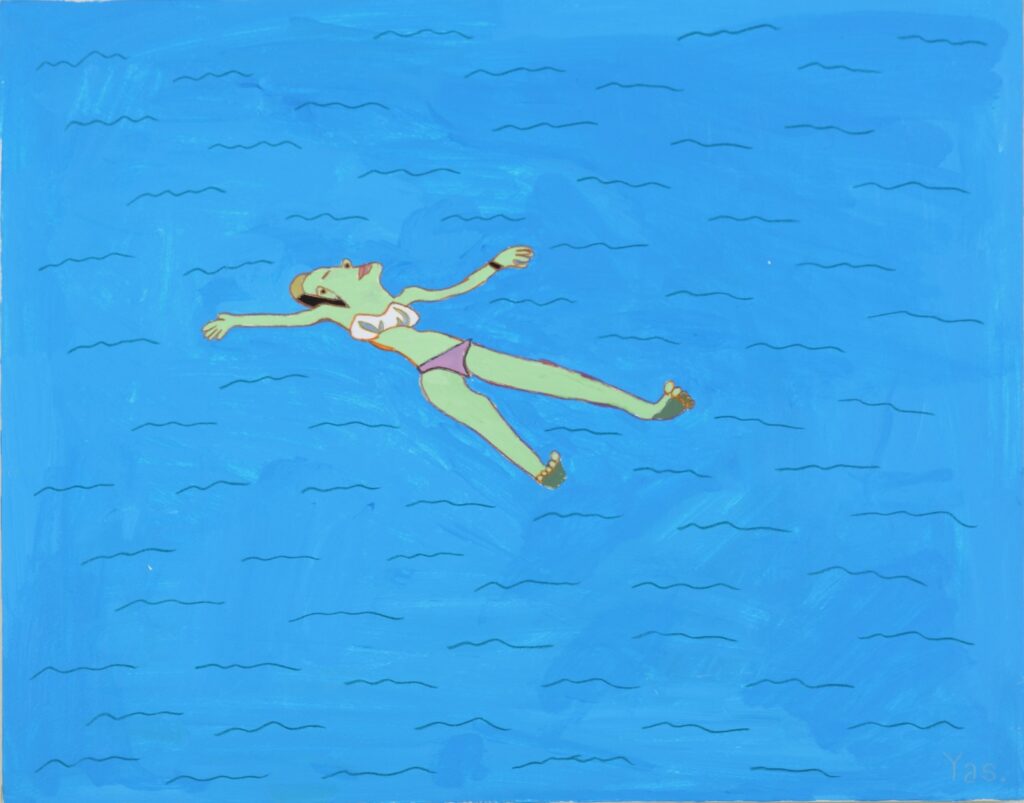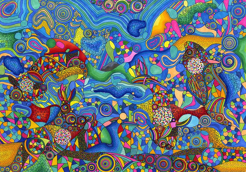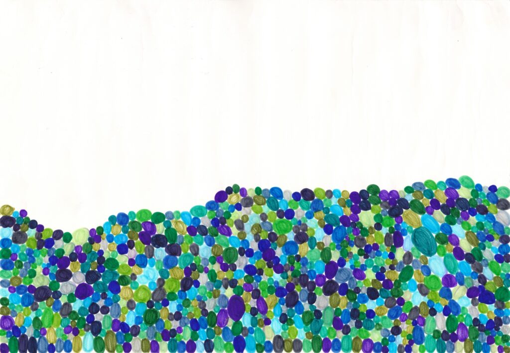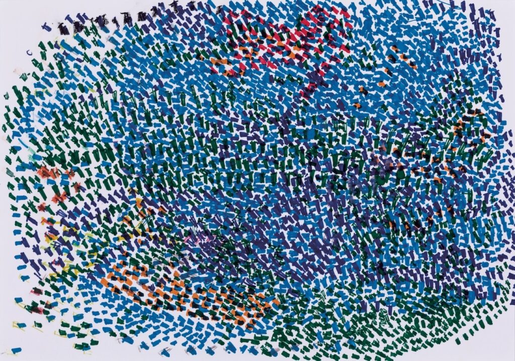 彼女の制作には、瞑想から生み出されるような果てしなさがある。完成形を目指して作り出しているのでなく、思いのままに打っていく点描や短い線の集積に何かを見出し、その世界にとめどなく没入して行く。ある時はふわふわと、夢見るように周囲の誰かに笑顔で話しかけ、またある時は、一人自分の内側の世界に深く意識を沈めている。そのまなざしは、彼女の心だけに映る何かを追いかけてたゆたう。不思議な空気が彼女と彼女の制作には漂っている。