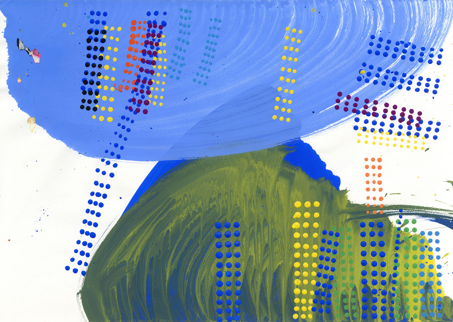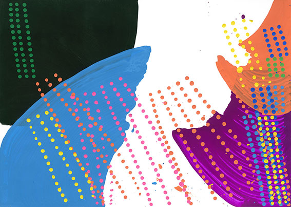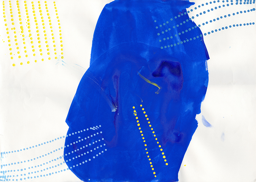 彼女の制作には、瞑想から生み出されるような果てしなさがある。完成形を目指して作り出しているのでなく、思いのままに打っていく点描や短い線の集積に何かを見出し、その世界にとめどなく没入して行く。ある時はふわふわと、夢見るように周囲の誰かに笑顔で話しかけ、またある時は、一人自分の内側の世界に深く意識を沈めている。そのまなざしは、彼女の心だけに映る何かを追いかけてたゆたう。不思議な空気が彼女と彼女の制作には漂っている。